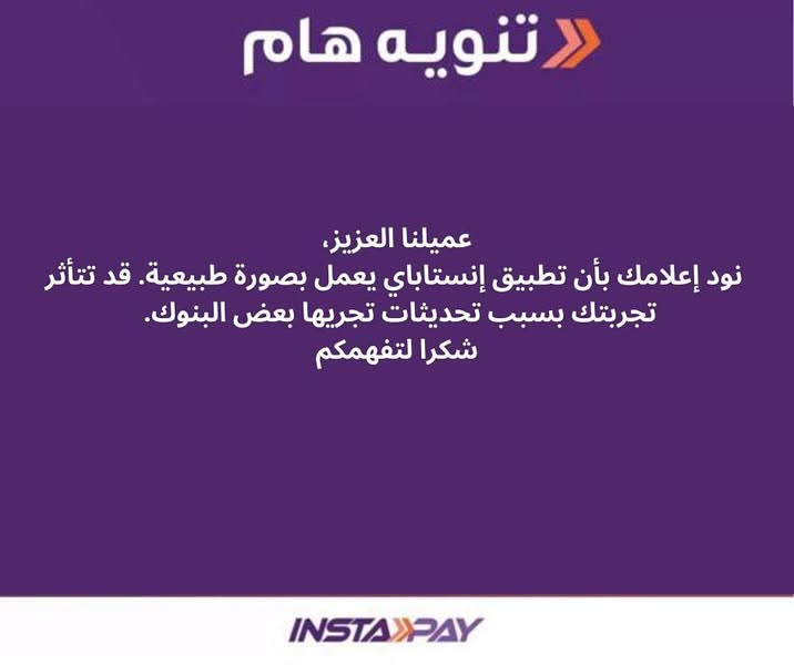 وجه تطبيق انستاباي رسالة مهمة لمستخدميه عبر صفحته الرسمية على موقع التواصل الاجتماعي، فيسبوك، بشأن حقيقة وجود أعطال في استخدام انستاباي، مؤكدا أن التطبيق يعمل بصورة طبيعية، ولا يوجد أي عطل من خلال التطبيق، وأن تأثر بعض الخدمات قد يرجع إلى تحديثات تجريها بعض البنوك.