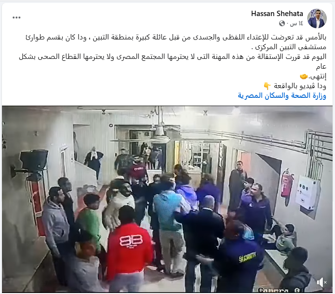أعلن ممرض في مستشفى التبين المركزي، يُدعى حسن شحاتة، تعرضه أمس الجمعة، لاعتداء لفظي وجسدي من قبل عائلة كبيرة بمنطقة التبين، خلال عمله في قسم الطوارئ بالمستشفى.