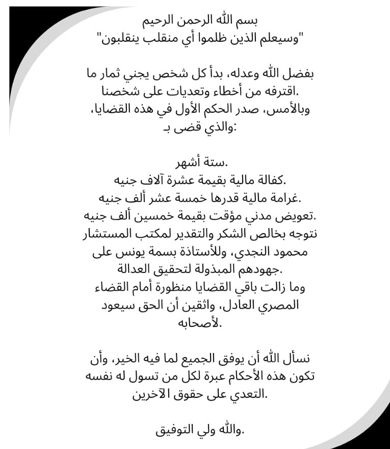 وكتبت مها أحمد: بفضل الله وعدله بدأ كل شخص يجني ثمار ما اقترفه، من أخطاء وتعديات على شخصنا وبالأمس، صدر الحكم الأول في هذه القضايا، والذي قضى بـ6 أشهر، وكفالة مالية بقيمة 10 آلاف جنيه، وغرامة مالية قدرها 15 ألف جنيه.