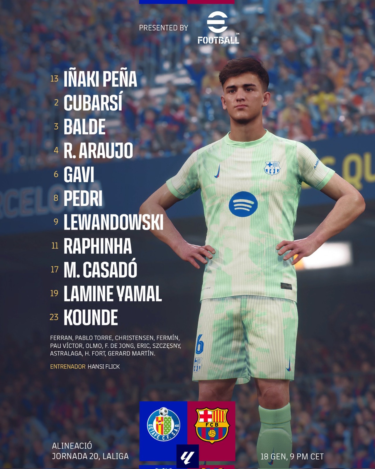 قرر المدرب الألماني هانز فليك المدير الفني لفريق برشلونة، أن يخوض مباراة فريقه لمواجهة نظيره خيتافي في الدوري الإسباني، بتشكيل مكون من: -