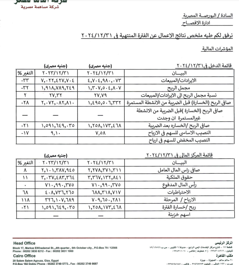 وأوضحت في بيان مرسل إلى البورصة، أن تلك الأسباب تتضمن حالة السوق التي لم تسمح ببيع منتج السكر منذ بداية موسم الإنتاج مما أدى إلى عدم توافر السيولة، وزيادة السحب على المكشوف، مما ترتب عليه زيادة الفوائد المدينة.
