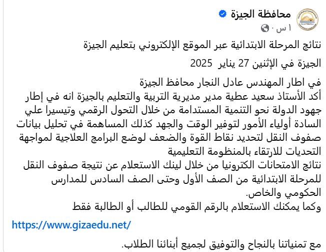 رابط نتيجة الصف السادس الابتدائي محافظة الجيزة
