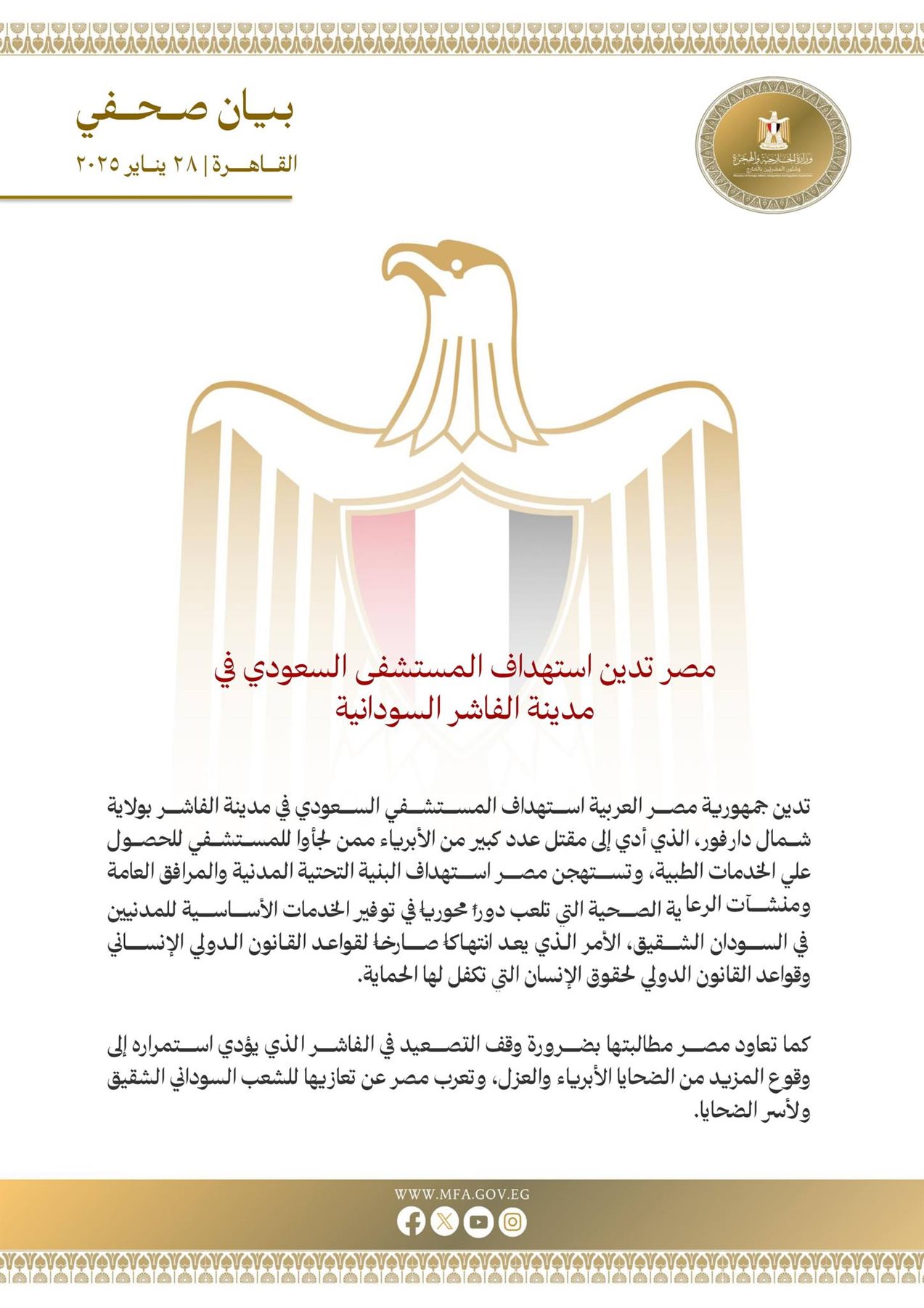 أدانت جمهورية مصر العربية استهداف المستشفى السعودي في مدينة الفاشر بولاية شمال دارفور، الذي أدى إلى مقتل عدد كبير من الأبرياء الذين لجأوا للمستشفى للحصول على الخدمات الطبية.