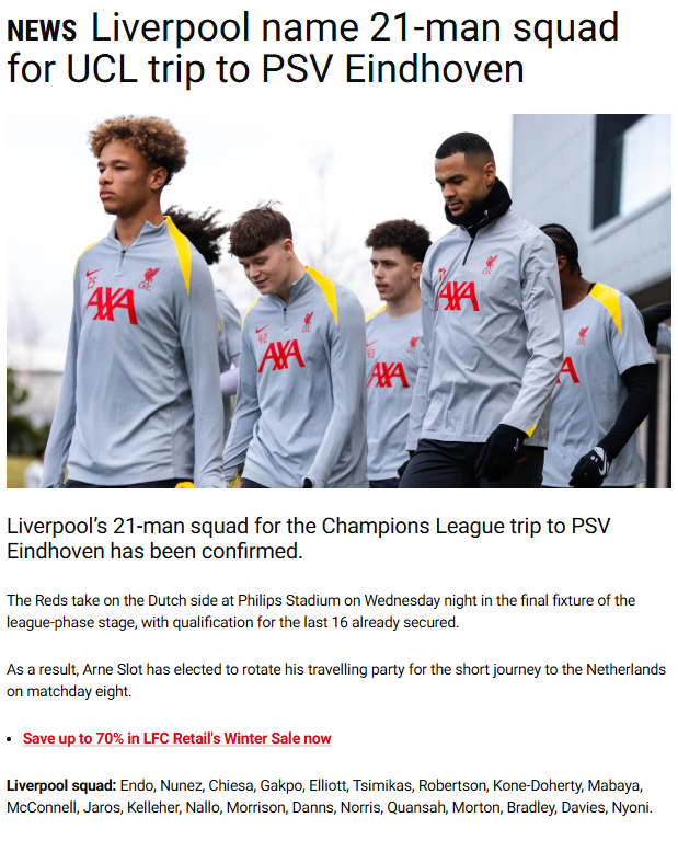 قرر المدرب الهولندي آرني سلوت المدير الفني لفريق ليفربول، خوض مباراة فريقه ضد بي إس في آيندهوفن الهولندي في الجولة الأخيرة بدوري الأبطال، بالقائمة الآتية: إندو، نونيز، كييزا، جاكبو، إليوت، تسيميكاس، روبرتسون، كوني دوهرتي، مابايا، ماكونيل، جاروس، كيليهر، نالو، موريسون، دانس، نوريس، كوانساه، مورتون، برادلي، ديفيز، نيوني.
