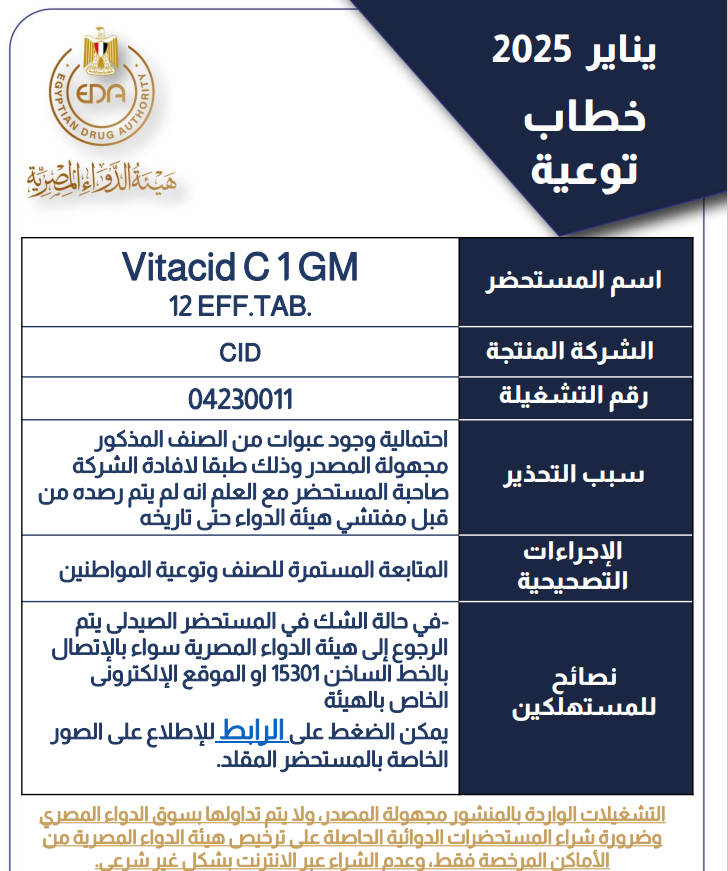 أصدرت هيئة الدواء المصرية تحذيرًا رسميًا بشأن وجود عبوات مجهولة المصدر من فوار فيتاسيد ج، إنتاج شركة سيد، والمستخدم في تقوية الجهاز المناعي، وتحسين امتصاص الجسم لمعدن الحديد، وتعزيز تدفق الدم المحمل بالأكسجين في الشرايين.