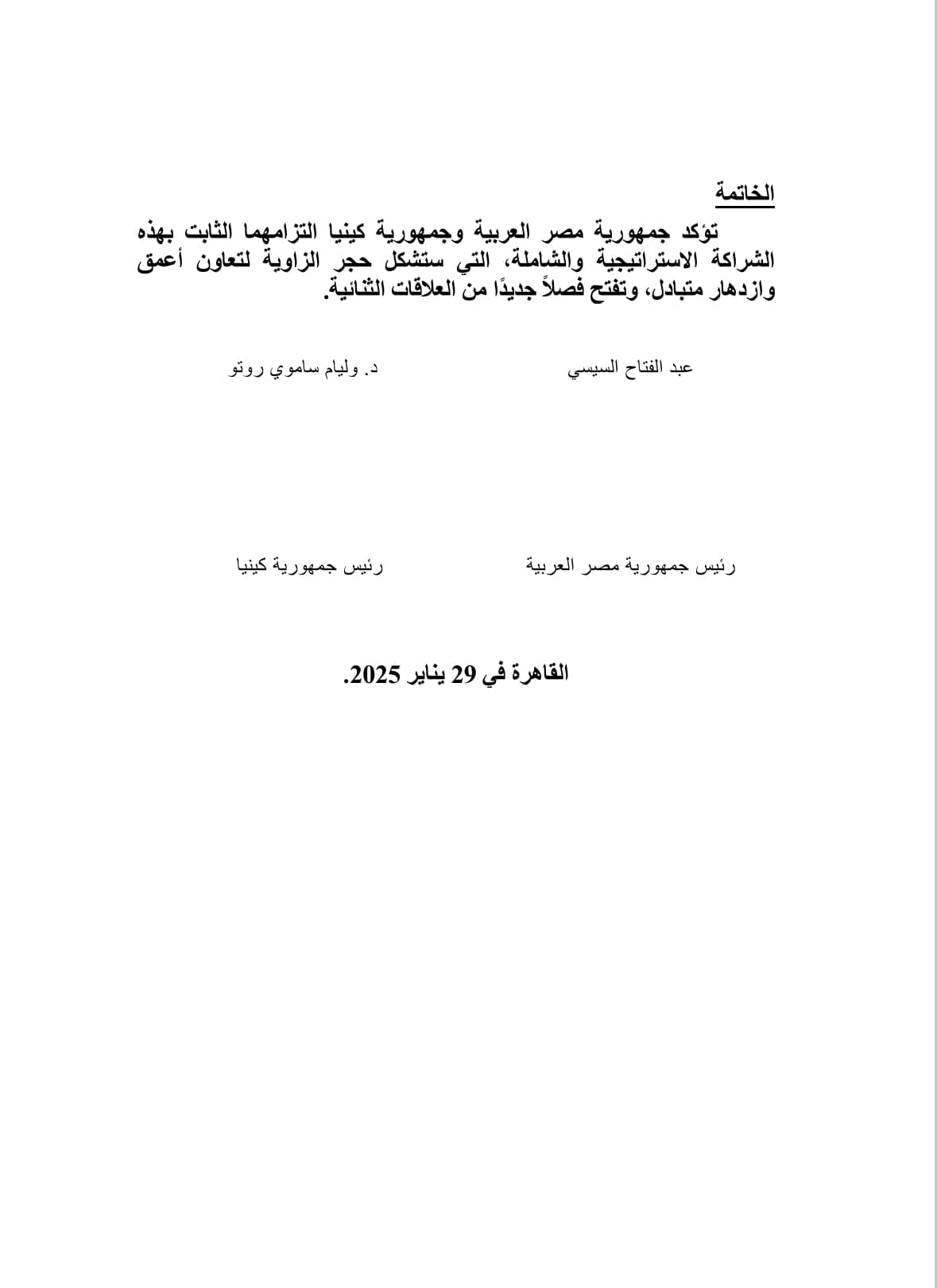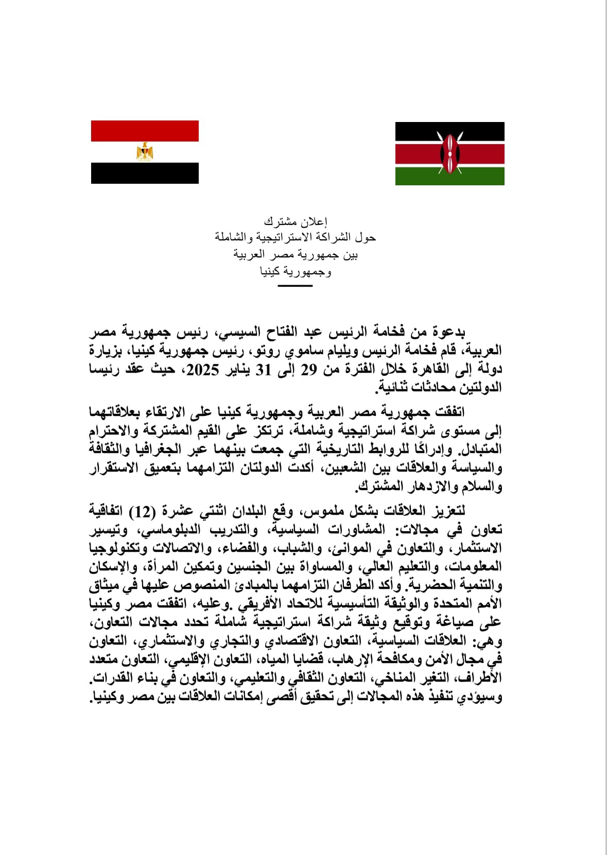 رئاسة الجمهورية تعلن تفاصيل الشراكة الاستراتيجية الشاملة بين مصر وكينيا