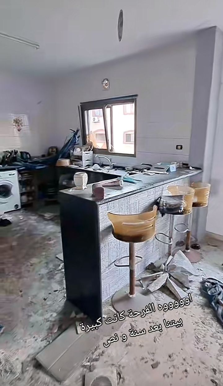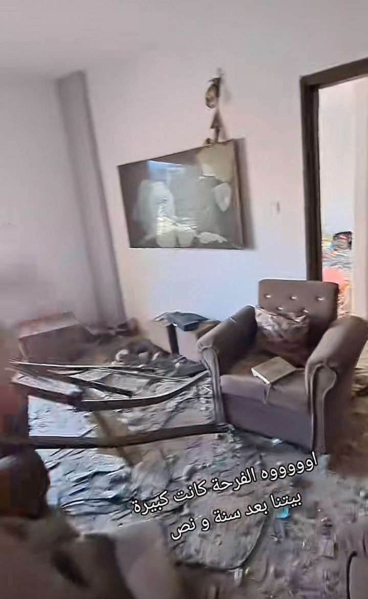 وقال الشاب الفلسطيني عبود جحجوح: طالع أشوف شقتي اللي مشتاق لها، الله أكبر ولله الحمد، الحمد لله رب العالمين الشقة موجودة، هذا مطبخي، ياه على فرحة زوجتي لما تيجي تشوف البيت مكانه، الشاشة فداء البلد كلها، كل الدمار فداء البلد، هذه عرفة لعب ولدي، وهذا الحمام أنضف من كل حياتنا في الخيام.