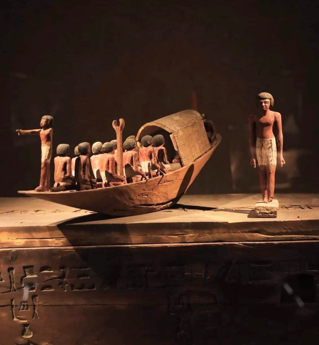 وقالت إدارة متحف إيمحتب بمنطقة آثار سقارة، إن هناك صفين من الأشخاص جالسين، وفي كل صف 5 أشخاص يمسك بعضهم بعصا، والآخرون بيديهم مجداف، وعلى مؤخرة القارب يظهر شخص آخر واقف ينظر عكس باقي الأشخاص ممسكا بيده اليمنى عصا، ربما ليرشد بها مراكب أخرى.