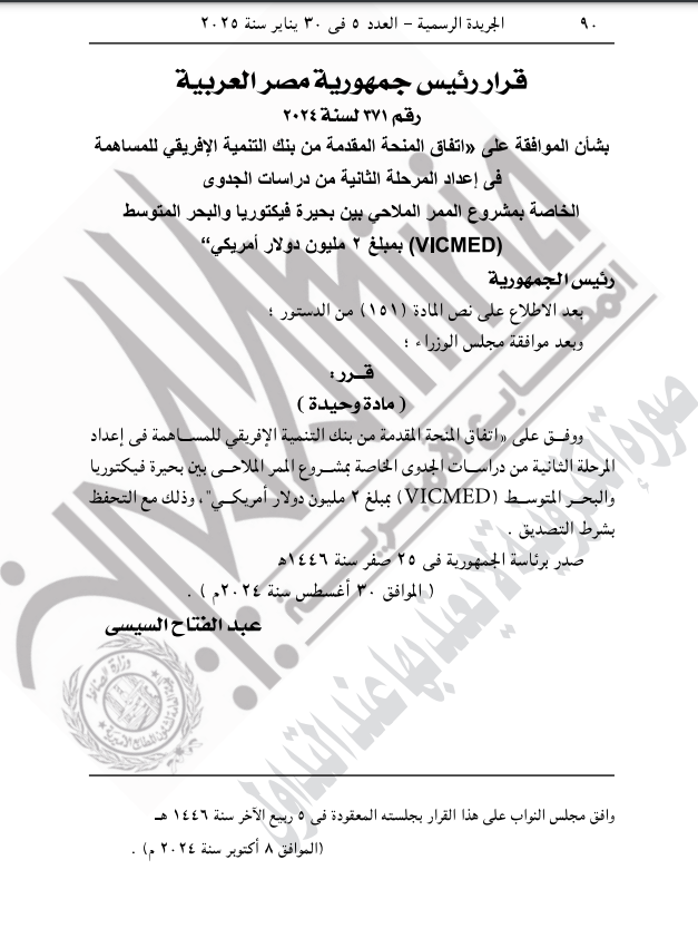 فيما نص القرار الثاني على الموافقة على اتفاق المنحة المقدمة من بنك التنمية الإفريقي للمساهمة في إعداد المرحلة الثانية من دراسات الجدوى الخاصة بمشروع الممر الملاحي بين بحيرة فيكتوريا والبحر المتوسط (VICMED) بمبلغ 2 مليون دولار أمريكي.