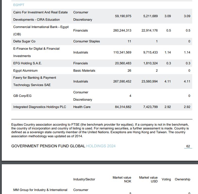 وأظهرت بيانات الصندوق السيادي النرويجي، أكبر صندوق سيادي في العالم، استثماره في أسهم سيرا للتعليم والبنك التجاري الدولي والمصرية للاتصالات وإم إم جروب للصناعة وعدة شركات أخرى.