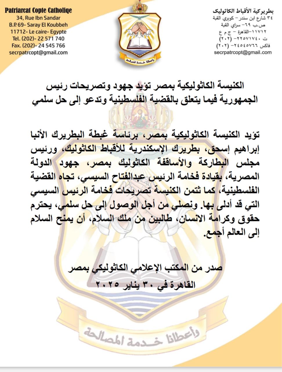 أعلنت الكنيسة الكاثوليكية بمصر، برئاسة غبطة البطريرك الأنبا إبراهيم إسحق، بطريرك الإسكندرية للأقباط الكاثوليك، ورئيس مجلس البطاركة والأساقفة الكاثوليك بمصر، تأييدها جهود الدولة المصرية، بقيادة الرئيس عبدالفتاح السيسي، تجاه القضية الفلسطينية.