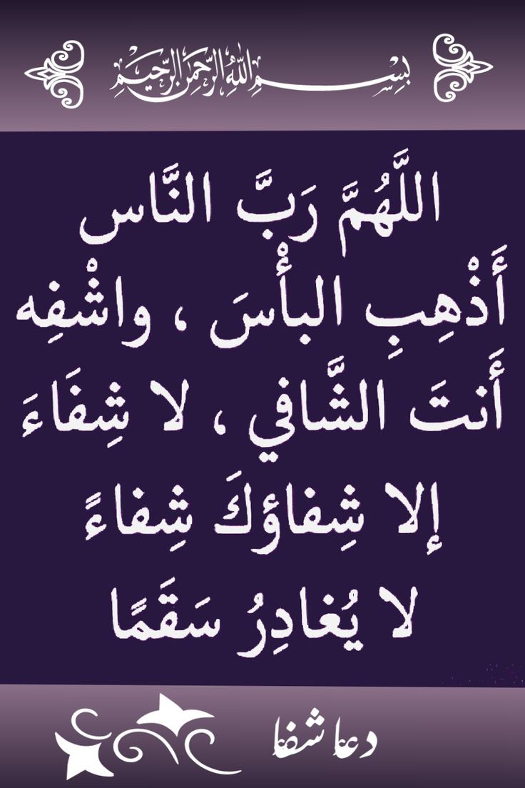 - إلهي أذهب البأس ربّ النّاس، اشف وأنت الشّافي، لا شفاء إلا شفاؤك، شفاءً لا يغادر سقمًا، أذهب البأس ربّ النّاس، بيدك الشّفاء، لا كاشف له إلّا أنت.