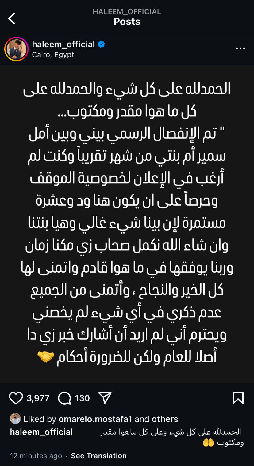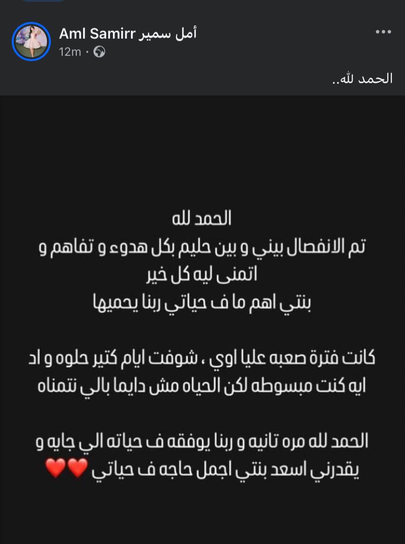 وقالت البلوجر أمل سمير، في منشورًا لها عبر حسابها الرسمي بموقع إنستجرام: الحمد لله تم الانفصال بيني وبين حليم بكل هدوء وتفاهم، أتمنى ليه كل الخير. بنتي أهم ما في حياتي ربنا يحميها، كانت فترة صعبة عليا أوي، شوفت أيام كتيرة حلوة وقد إيه كنت مبسوطة لكن الحياة مش دايمًا باللي نتمناه.