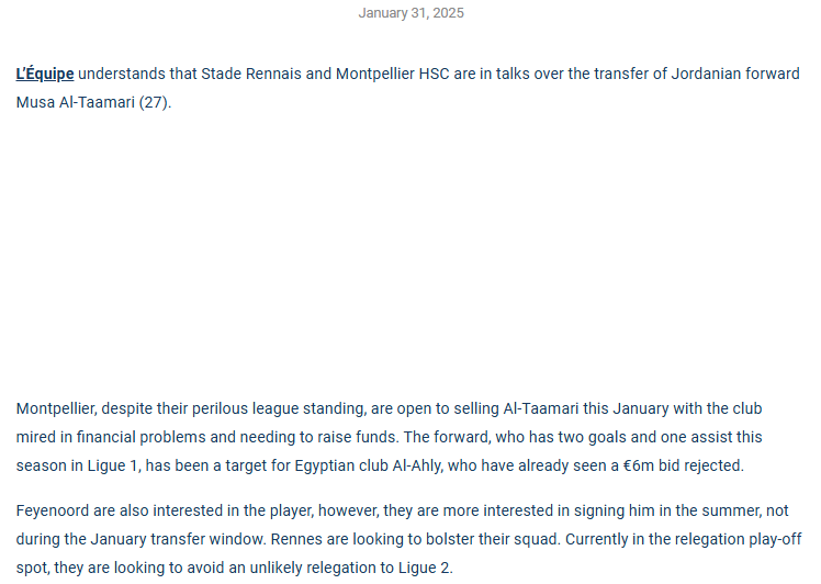 وأكدت الصحيفة، أن ناديا رين ومونبلييه يجريان محادثات بشأن انتقال المهاجم الأردني موسى التعمري.