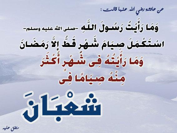 كما أن النبي صلى الله عليه وسلم كان يكثر الصوم في شعبان لدرجة قد تقارب صيامه كله، إذ قالت السيدة عائشة رضى الله عنها: "كان رسول الله صلّى الله عليه وسلّم يصوم حتى نقول لا يفطر، ويفطر حتى نقول لا يصوم، وما رأيت رسول الله صلّى الله عليه وسلّم استكمل صيام شهر قط إلا شهر رمضان، وما رأيته فى شهر أكثر صيامًا منه فى شعبان".