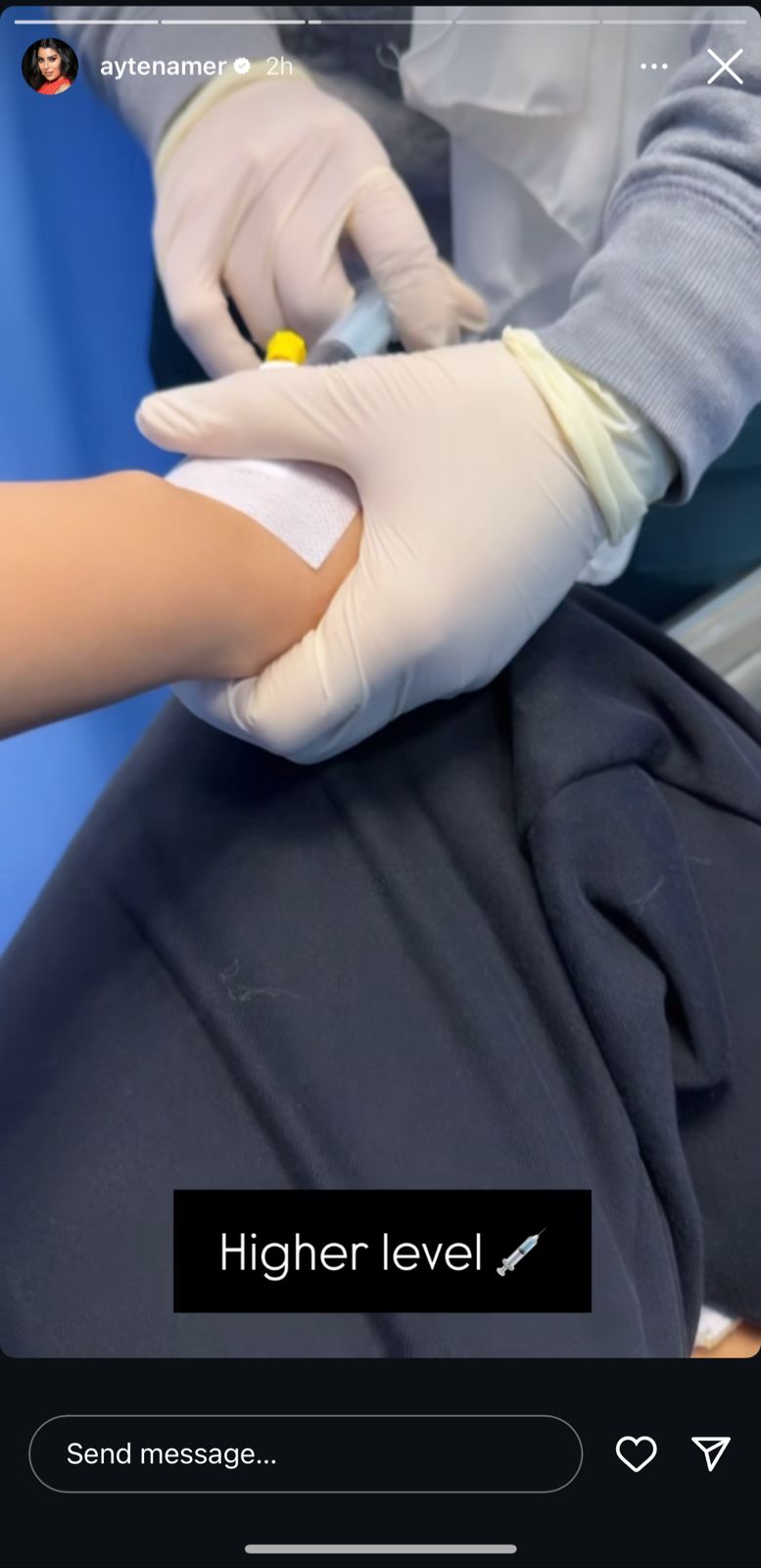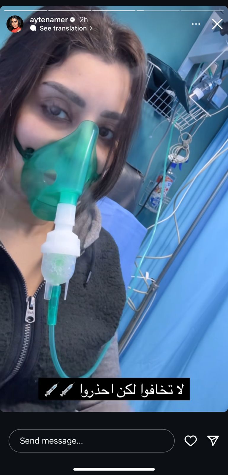 ونشرت أيتن عامر، صورة من المستشفى عبر حسابها الشخصي بموقع تبادل الصور والفيديوهات انستجرام، وظهرت وهي تعلق المحاليل وكتبت قائلة: لا تخافوا لكن احذروا.