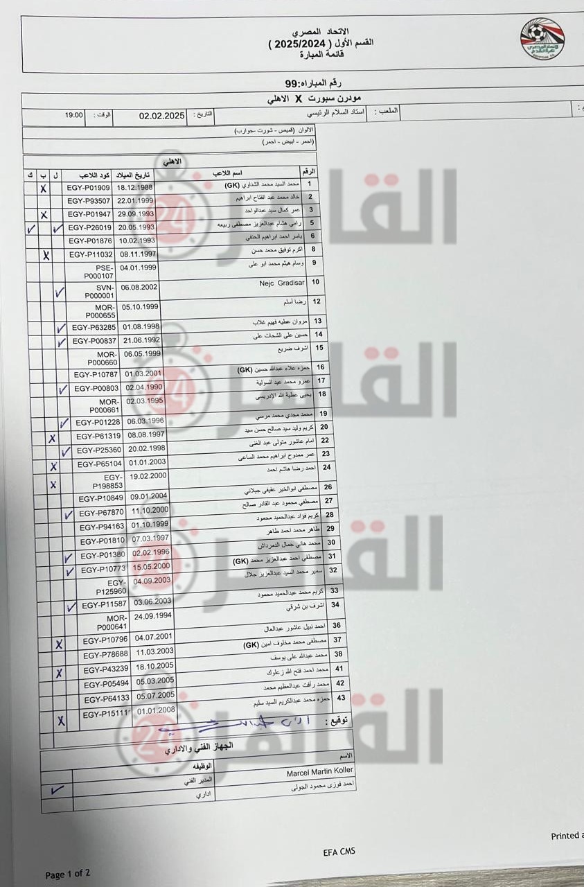 وينفرد القاهرة 24 بنشر مستند يثبت صحة موقف مشاركة عمر الساعي في مباراة الأهلي ومودرن سبورت، ووجود اللاعب على مقاعد البدلاء.