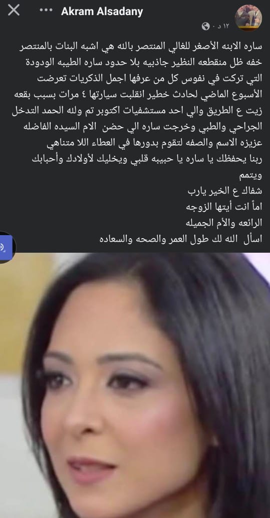وقال أكرم السعدني: سارة الابنة الصغرى للغالي المنتصر بالله هي أشبه البنات بالمنتصر خفة ظل منقطعة النظير جاذبية بلا حدود، سارة الطيبة الودودة التي تركت في نفوس كل من عرفها أجمل الذكريات، تعرضت الأسبوع الماضي لحادث خطير انقلبت سيارتها 4 مرات بسبب بقعة زيت على الطريق، وتم نقلها لـ أحد مستشفيات أكتوبر تم ولله الحمد التدخل الجراحي والطبي وخرجت سارة إلى حضن الأم السيدة الفاضلة عزيزة الاسم والصفة لتقوم بدورها في العطاء اللا متناهي.