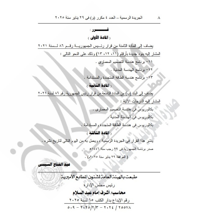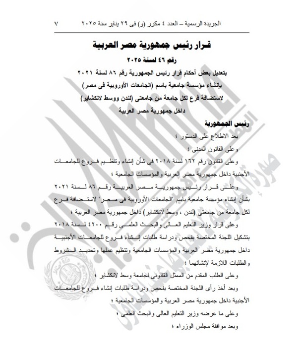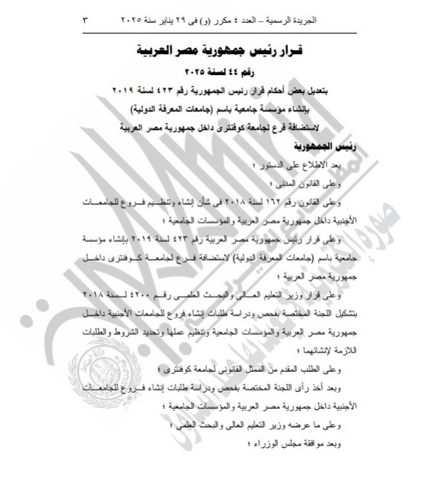 وجاء ذلك بعد الاطلاع على الدستور وعلى القانون المدني، وعلى القانون رقم 162 لسنة 2018 في شأن إنشاء وتنظيم فروع للجامعات الأجنبية داخل جمهورية مصر العربية والمؤسسات الجامعية، وعلى قرار رئيس الجمهورية لاستضافة فرع لجامعة كوفنتري داخل مصر، وعلى قرار وزير التعليم العالي بتشكيل اللجنة المختصة بفحص ودراسة طلبات إنشاء فروع للجامعات الأجنبية داخل جمهورية مصر العربية.