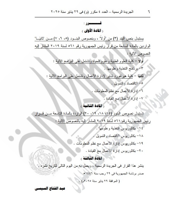وقالت الجريدة الرسمية، إن المادة الأولى من القرار تضمنت بأن يضاف إلى المادة السابعة من قرار رئيس الجمهورية رقم 423 لسنة 2019 المشار إليه، بند جديد وذلك على النحو التالي: برنامج العلاج الطبيعي، مشيرة إلى أن المادة الثانية من قرار تشمل: إضافة بكالوريوس العلاج الطبيعي.