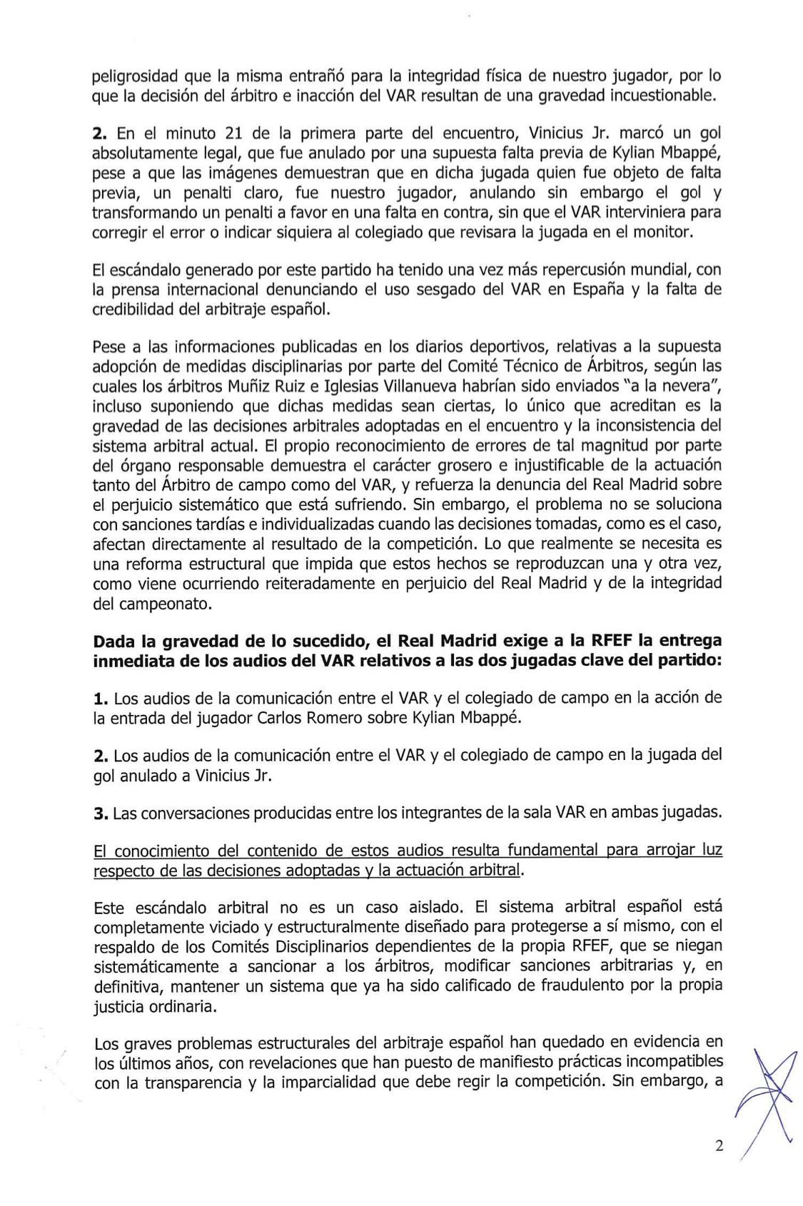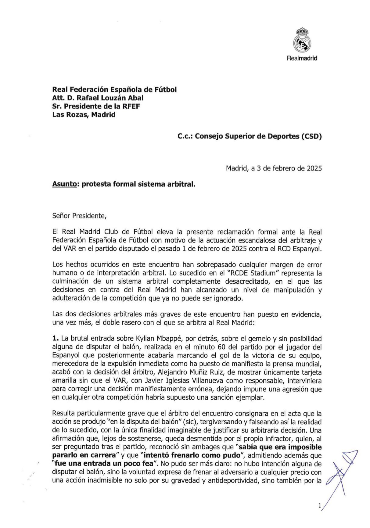 وقال نادي ريال مدريد في شكواه المقدمة لـ الاتحاد الإسباني لكرة القدم والمجلس الأعلى لـ الرياضة: يقدم نادي ريال مدريد احتجاجًا رسميًا إلى الاتحاد الإسباني لكرة القدم بشأن الأداء التحكيمي الفاضح، بما في ذلك قرارات الـVAR، خلال المباراة التي أقيمت في 1 فبراير 2025 ضد إسبانيول.