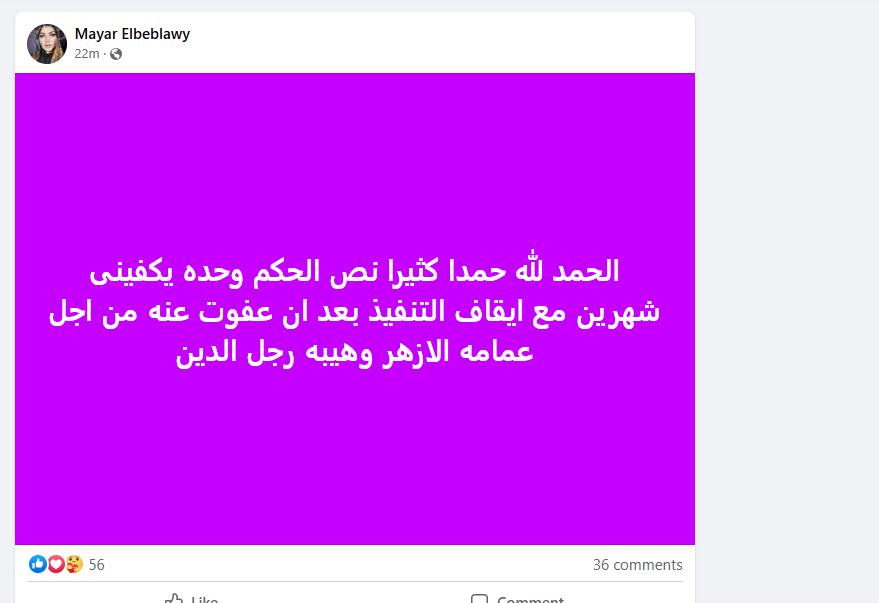 وكتبت ميار الببلاوي، عبر حسابها الشخصي بموقع التواصل الاجتماعي فيسبوك: الحمد لله حمدًا كثيرًا نص الحكم وحده يكفينى شهرين مع إيقاف التنفيذ بعد أن عفوت عنه من أجل عمامة الأزهر وهيبه رجل الدين.