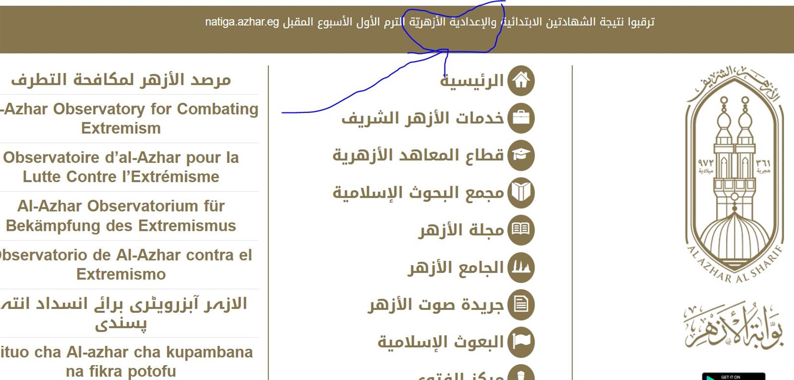 - الدخول على الصفحة الرئيسية الخاصة بالبوابة: تظهر العديد من الأيقونات، ستجد عبارة في الأعلى (ترقبوا نتيجة الشهادة الابتدائية والإعدادية الترم الأول الأسبوع المقبل عبر natiga.azhar.eg)، قم بالضغط عليها، لتتوجه إلى صفحة أخرى.