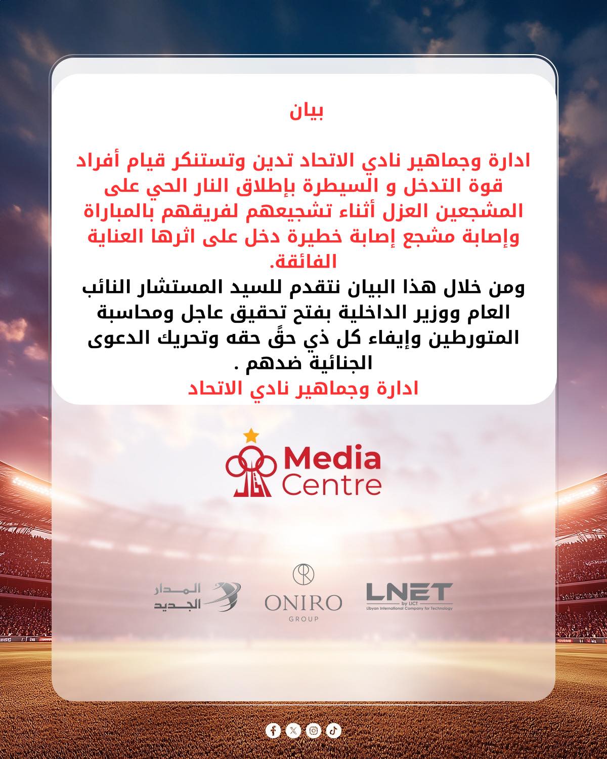 وقال نادي الاتحاد الليبي في بيان رسمي عبر حسابه الرسمي على موقع التواصل الاجتماعي فيسبوك: إدارة وجماهير نادي الاتحاد تدين وتستنكر إطلاق أفراد قوة التدخل والسيطرة النار على المشجعين العزل خلال تشجيعهم لفريقهم بالمباراة وإصابة مشجع إصابة خطيرة دخل على إثرها العناية الفائقة.