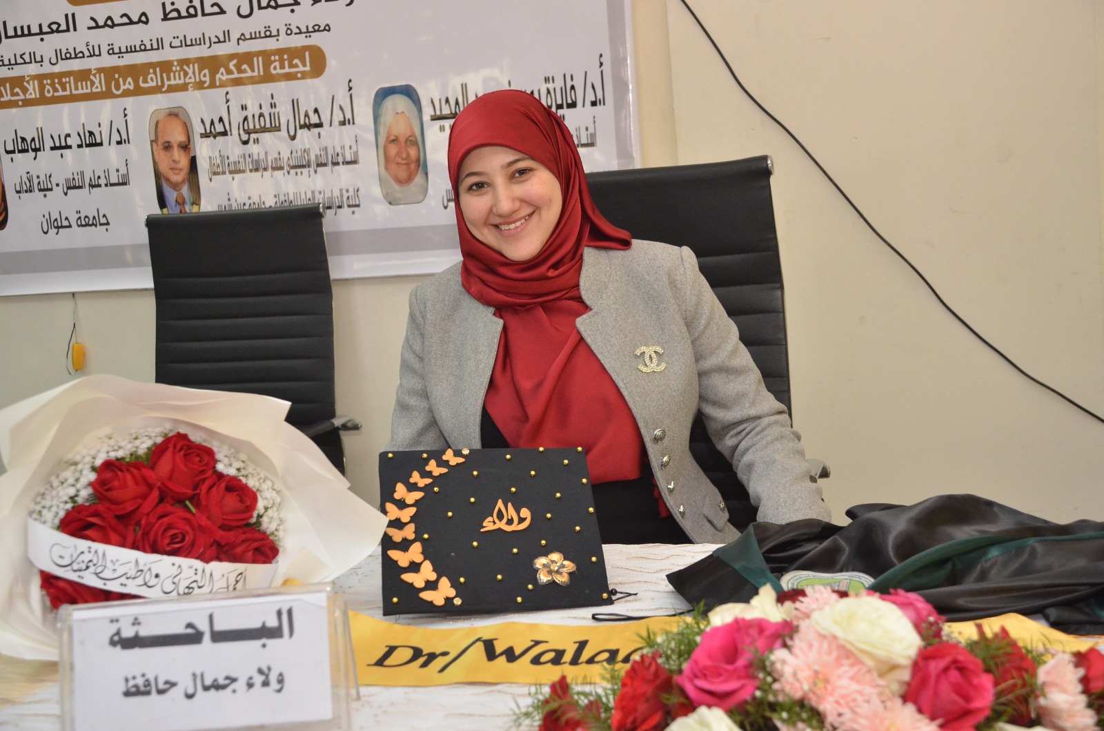 وتكونت لجنة الأساتذة المشرفين من الدكتورة فايزة يوسف عبد المجيد أستاذ علم النفس وعميد كلية الدراسات العليا للطفولة الأسبق بجامعة عين شمس، والدكتورة إيناس راضي يونس أستاذ علم النفس الإكلينكي المساعد بقسم الدراسات النفسية للأطفال مشرفًا ومناقشًا، والدكتور جمال أحمد شفيق أستاذ علم النفس الإكلينيكي مناقشًا داخليًا، والدكتورة نهاد عبدالوهاب محمود أستاذ علم النفس بكلية الآداب جامعة حلوان مناقشًا خارجيًا.