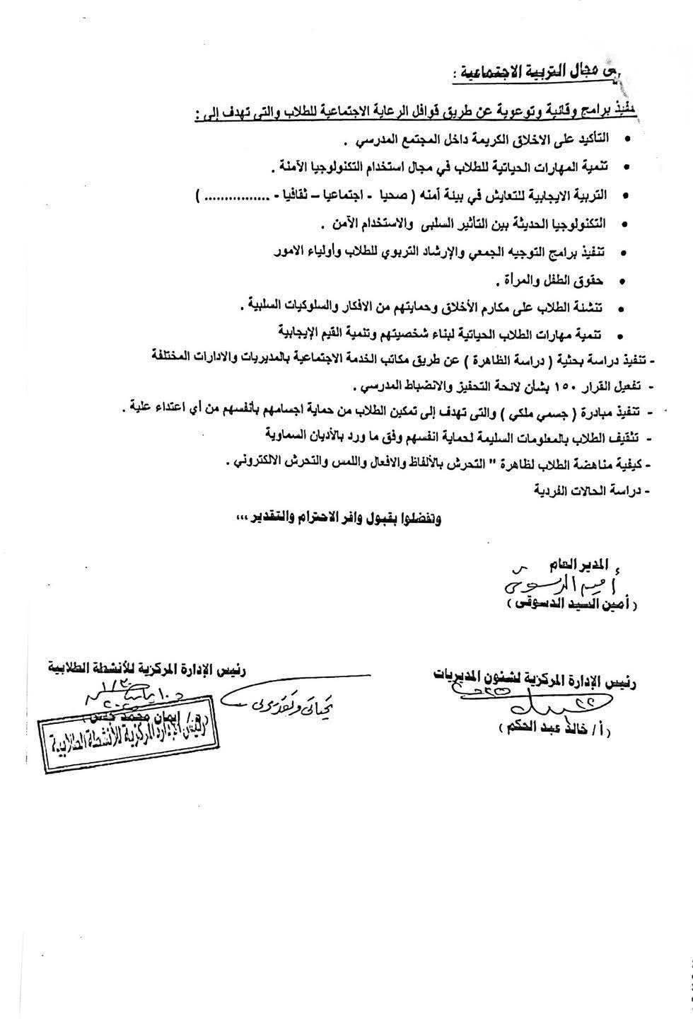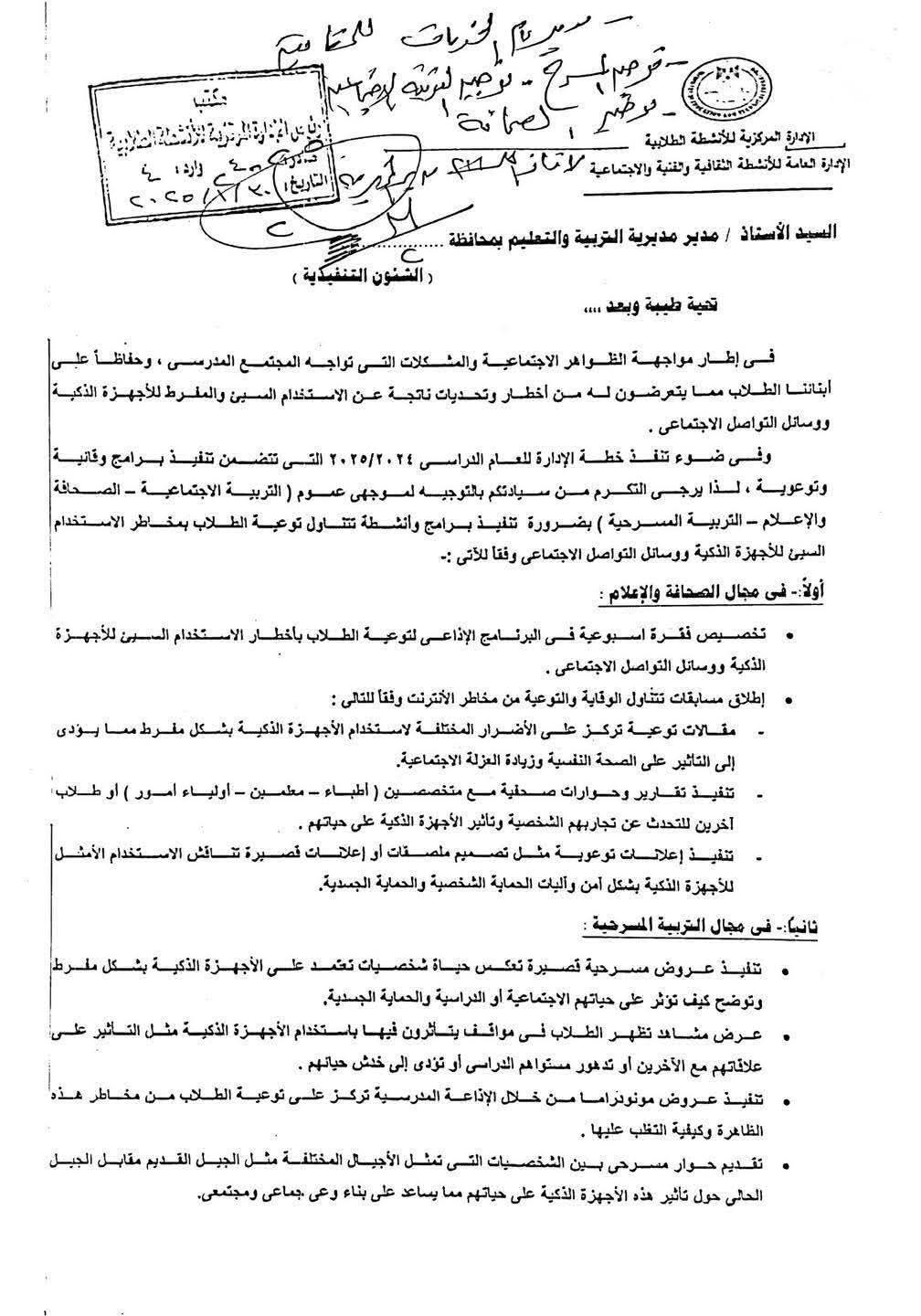 وأكدت وزارة التربية والتعليم، أنه في ضوء تنفذ خطة الإدارة للعام الدراسي2024/2025 التي تتضمن تنفيذ برامج وقائية وتوعوية، لذا يرجى التكرم من بالتوجيه الموجهي عموم « التربية الاجتماعية - الصحافة والإعلام - التربية المسرحية» بضرورة تنفيذ برامج وأنشطة تتناول توعية الطلاب بمخاطر الاستخدام السيئ للأجهزة الذكية ووسائل التواصل الاجتماعي وفقا للآتي:-