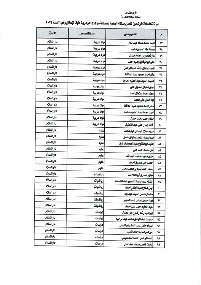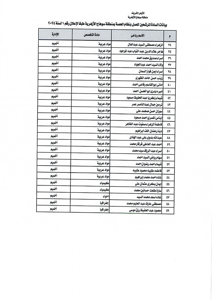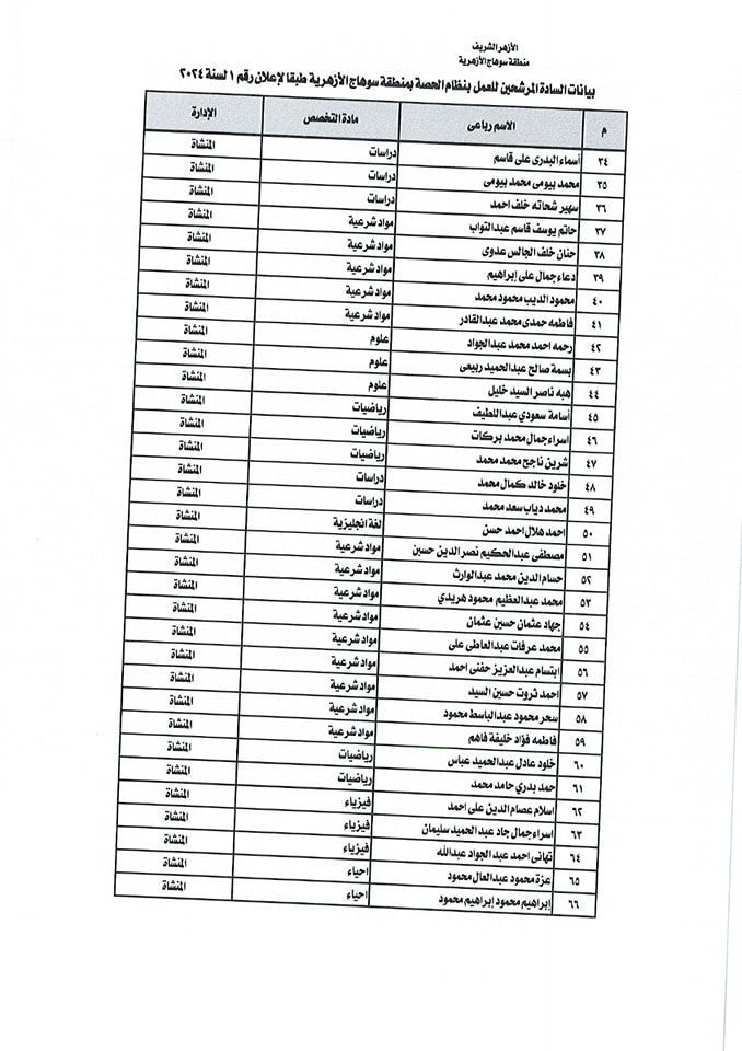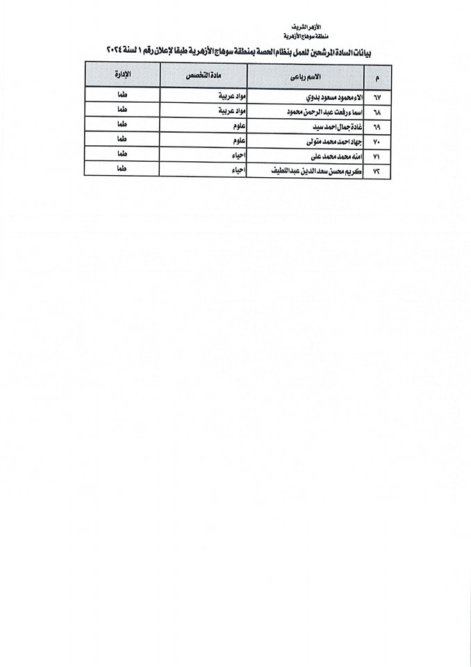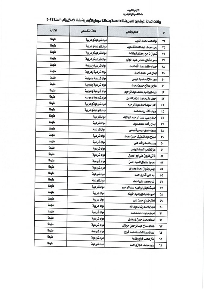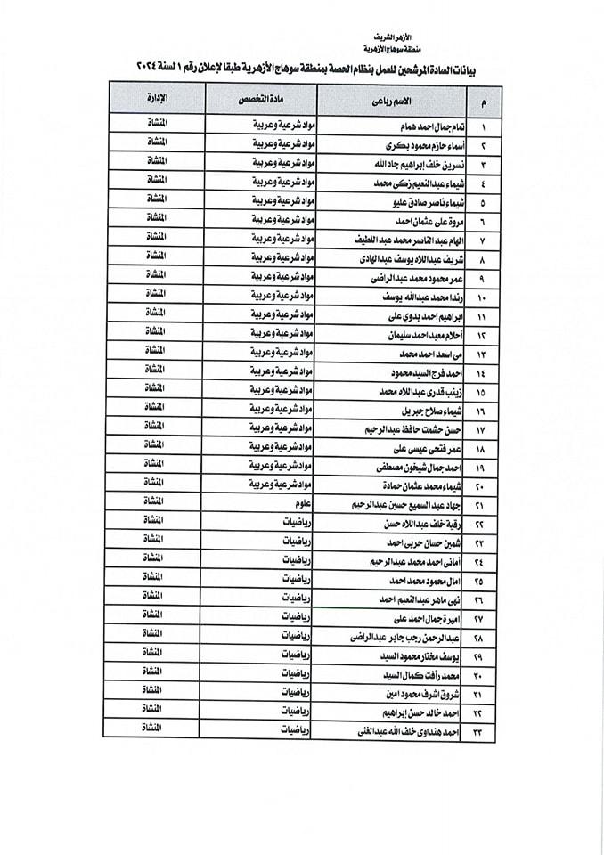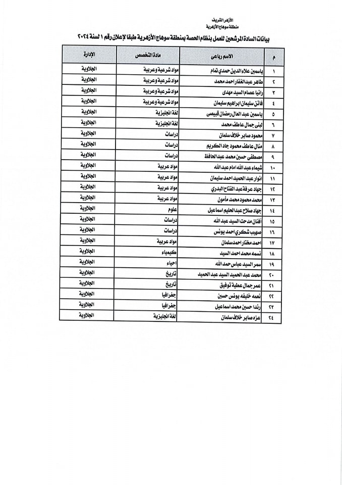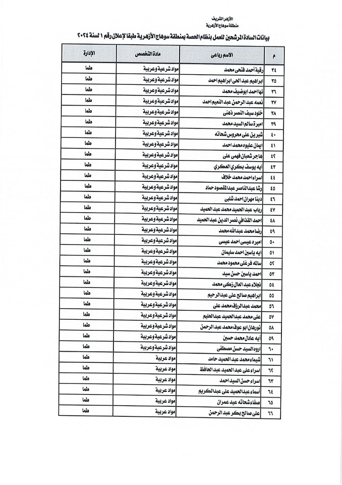 ننشر أسماء المقبولين في مسابقة معلمي الحصة بمنطقة سوهاج الأزهرية