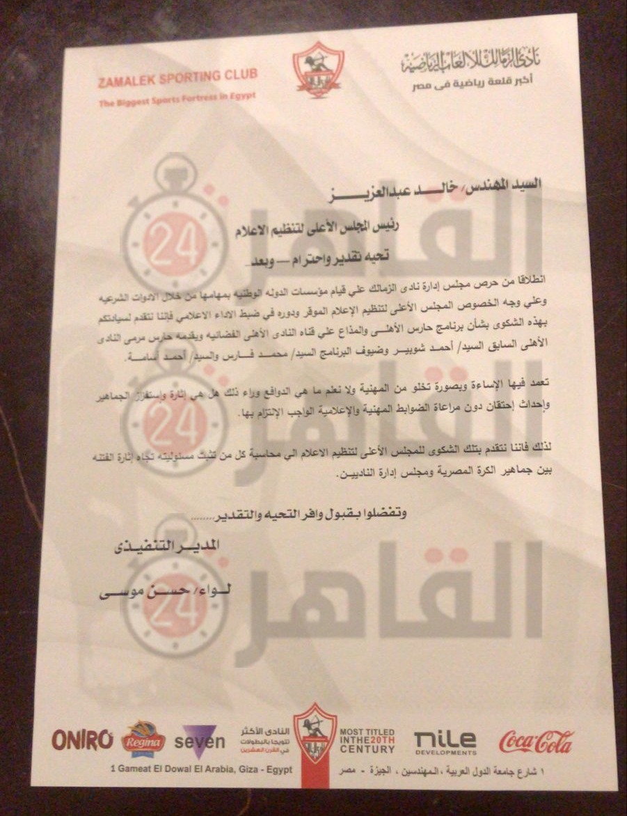 انطلاقا من حرص مجلس إدارة نادي الزمالك على قيام مؤسسات الدولة الوطنية بمهامها من خلال الأدوات الشرعية وعلى وجه الخصوص المجلس الأعلى لتنظيم الإعلام الموقر ودوره في ضبط الأداء الإعلامي، فإننا نتقدم بهذه الشكوى بشأن برنامج حارس الأهلي والمذاع على قناة النادي الأهلي الفضائية ويقدمه حارس مرمى النادي الأهلي السابق أحمد شوبير وضيفي البرنامج محمد فارس والسيد أحمد أسامة، حيث تعمد فيها الإساءة وبصورة تخلو من المهنية ولا نعلم ما هي الدوافع وراء ذلك هل هي إثارة واستفزاز الجماهير وإحداث احتقان دون مراعاة الضوابط المهنية والإعلامية الواجب الالتزام بها.