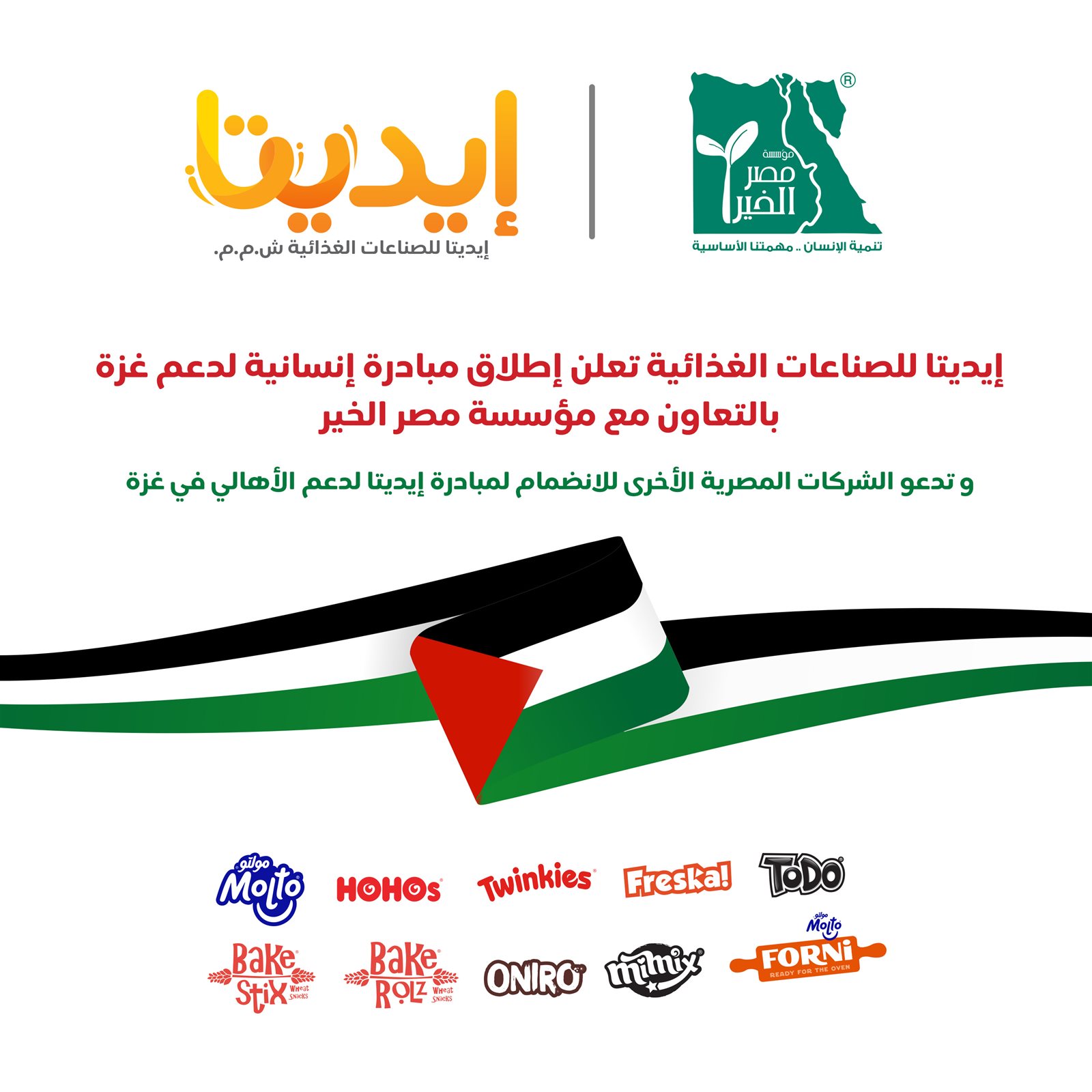 أعلنت شركة إيديتا للصناعات الغذائية الرائدة بصناعة الأغذية الخفيفة المعبأة آليًا في مصر، عن إطلاق مبادرة إنسانية ضخمة لدعم أهالي غزة بالتعاون مع مؤسسة مصر الخير، وذلك استجابةً لإعادة فتح الحدود بين مصر وغزة، مما يوفر فرصة أمام ايديتا لتقديم الدعم للأهالي في غزة.