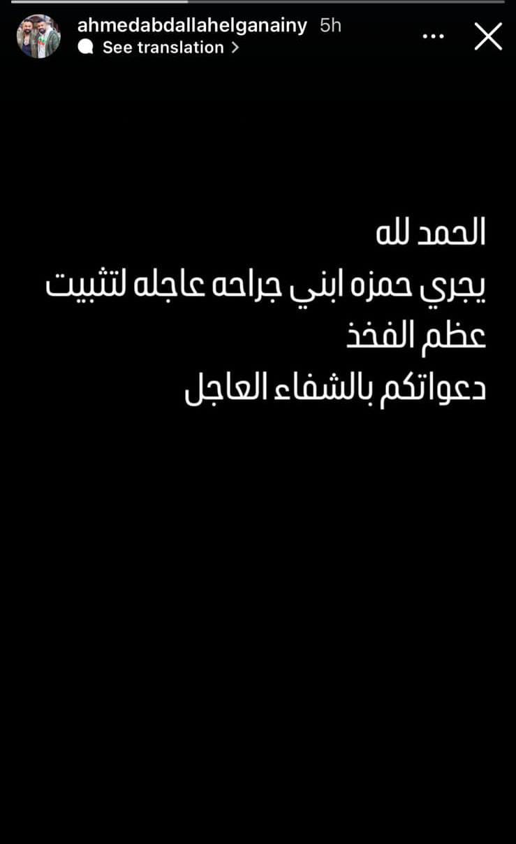 كتب أحمد عبد الله منشورًا عبر حسابه الشخصي بموقع انستجرام، جاء فيه: الحمد الله، يجري حمزة ابني، جراحة عاجلة لتثبيت عظم الفخذ دعواتكم بالشفاء العاجل.