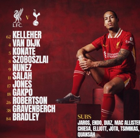 ويأتي على مقاعد بدلاء الفريق: جاروس - إندو - دياز - أليستر - كييزا - إليوت - جوتا - تسيميكاس - كوانساه.