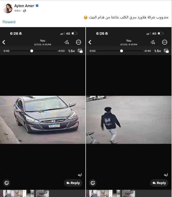 وكتبت آيتن عامر، في منشور عبر حسابها الشخصي على فيسبوك، مرفقة بصور من كاميرا المراقبة ظهر خلال المندوب: مندوب شركة سرق الكلب بتاعنا من قدام البيت.