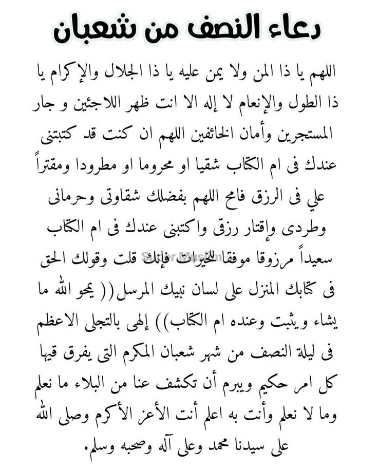 "اللَّهُمَّ يَا ذَا الْمَنِّ وَلَا يُمَنُّ عَلَيْهِ، يَا ذَا الْجَلَالِ وَالإِكْرَامِ، يَا ذَا الطَّوْلِ وَالإِنْعَامِ. لَا إِلَهَ إِلَّا أَنْتَ ظَهْرَ اللَّاجِئينَ، وَجَارَ الْمُسْتَجِيرِينَ، وَأَمَانَ الْخَائِفِينَ.. اللَّهُمَّ إِنْ كُنْتَ كَتَبْتَنِي عِنْدَكَ فِي أُمِّ الْكِتَابِ شَقِيًّا أَوْ مَحْرُومًا أَوْ مَطْرُودًا أَوْ مُقَتَّرًا عَلَيَّ فِي الرِّزْقِ، فَامْحُ اللَّهُمَّ بِفَضْلِكَ شَقَاوَتِي وَحِرْمَانِي وَطَرْدِي وَإِقْتَارَ رِزْقِي، وَأَثْبِتْنِي عِنْدَكَ فِي أُمِّ الْكِتَابِ سَعِيدًا مَرْزُوقًا مُوَفَّقًا لِلْخَيْرَاتِ، فَإِنَّكَ قُلْتَ وَقَوْلُكَ الْحَقُّ فِي كِتَابِكَ الْمُنَزَّلِ عَلَى لِسَانِ نَبِيِّكَ الْمُرْسَلِ: ﴿يَمْحُو اللهُ مَا يَشَاءُ وَيُثْبِتُ وَعِنْدَهُ أُمُّ الْكِتَابِ﴾، إِلَهِي بِالتَّجَلِّي الْأَعْظَمِ فِي لَيْلَةِ النِّصْفِ مِنْ شَهْرِ شَعْبَانَ الْمُكَرَّمِ، الَّتِي يُفْرَقُ فِيهَا كُلُّ أَمْرٍ حَكِيمٍ وَيُبْرَمُ، أَنْ تَكْشِفَ عَنَّا مِنَ الْبَلَاءِ مَا نَعْلَمُ وَمَا لَا نَعْلَمُ وَمَا أَنْتَ بِهِ أَعْلَمُ، إِنَّكَ أَنْتَ الْأَعَزُّ الْأَكْرَمُ. وَصَلَّى اللهُ عَلَى سَيِّدِنَا مُحَمَّدٍ النَّبِيِّ الأُمِّيِّ وَعَلَى آلِهِ وَصَحْبِهِ وَسَلَّمَ"