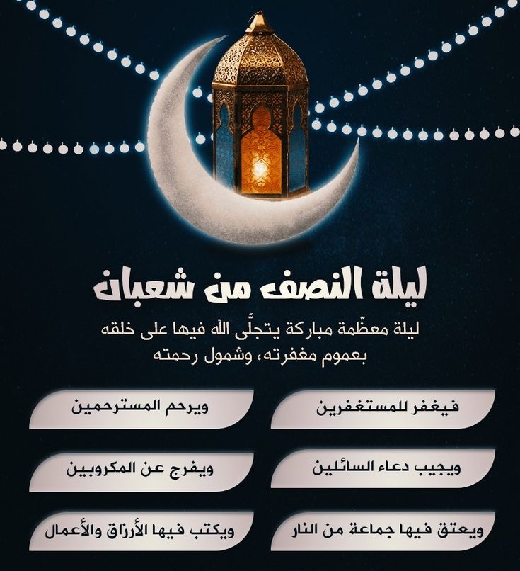 - يا رب بحق ليلة النصف من شعبان، اللَّهُمَّ اغْفِرْ له وَارْحَمْه، وَاعْفُ عنْه وَعَافِهِ، وَأَكْرِمْ نُزُلَهُ، وَوَسِّعْ مُدْخَلَهُ، وَاغْسِلْهُ بالمَاءٍ وَالثَلْجٍ وَالبَرَدٍ، وَنَقِّهِ مِنَ الخَطَايَا كما يُنَقَّى الثَّوْبُ الأبْيَضُ مِنَ الدَّنَسِ، وَأَبْدِلْه دَارًا خَيْرًا مِن دَارِه، وَأَهْلًا خَيْرًا مِن أَهْلِهِ، وَزَوْجًا خَيْرًا مِن زَوْجِهِ، وَقِهِ فِتْنَةَ القَبْرِ وَعَذَابَ النَّار.