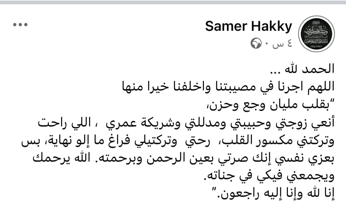 من جانبه، كتب زوجها سامر عبر حسابه على فيسبوك قائلًا: الحمد لله، اللهم أجرنا في مصيبتنا، واخلفنا خيرًا منها. بقلب مليء بالوجع والحزن، أنعى زوجتي، حبيبتي، مدللتي، وشريكة عمري، التي رحلت وتركتني مكسور القلب. رحلتِ وتركتِ لي فراغًا كبيرًا لا نهاية له، لكنني أواسي نفسي بأنكِ صرتِ بعين الرحمن. الله يرحمكِ ويجمعني بكِ في جناته. إنا لله وإنا إليه راجعون.