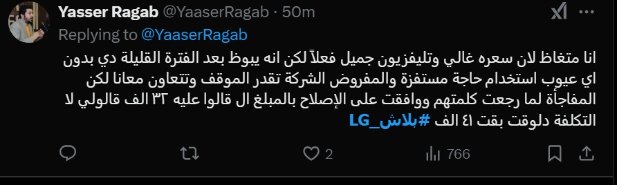 شارك مستخدمو منصة x منشورات عبر حساباتهم الشخصية، عن تجاربهم مع شركة LG، حيث كتب أحد الأشخاص: مكان بقي الأسوأ في مصر، وخدمة ما بعد البيع صفر، ومفيش أي تقدير أو احترام للعميل.