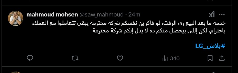 وأضاف مستخدم آخر عن خدمة ما بعد البيع عبر حسابه: أسوأ خدمة LG خاصة بعد البيع، زي الزفت، لو فاكرين نفسكم شركة محترمة يبقى تتعاملوا مع العملاء باحترام، لكن اللي بيحصل منكم ده لا يدل إنكم شركة محترمة.