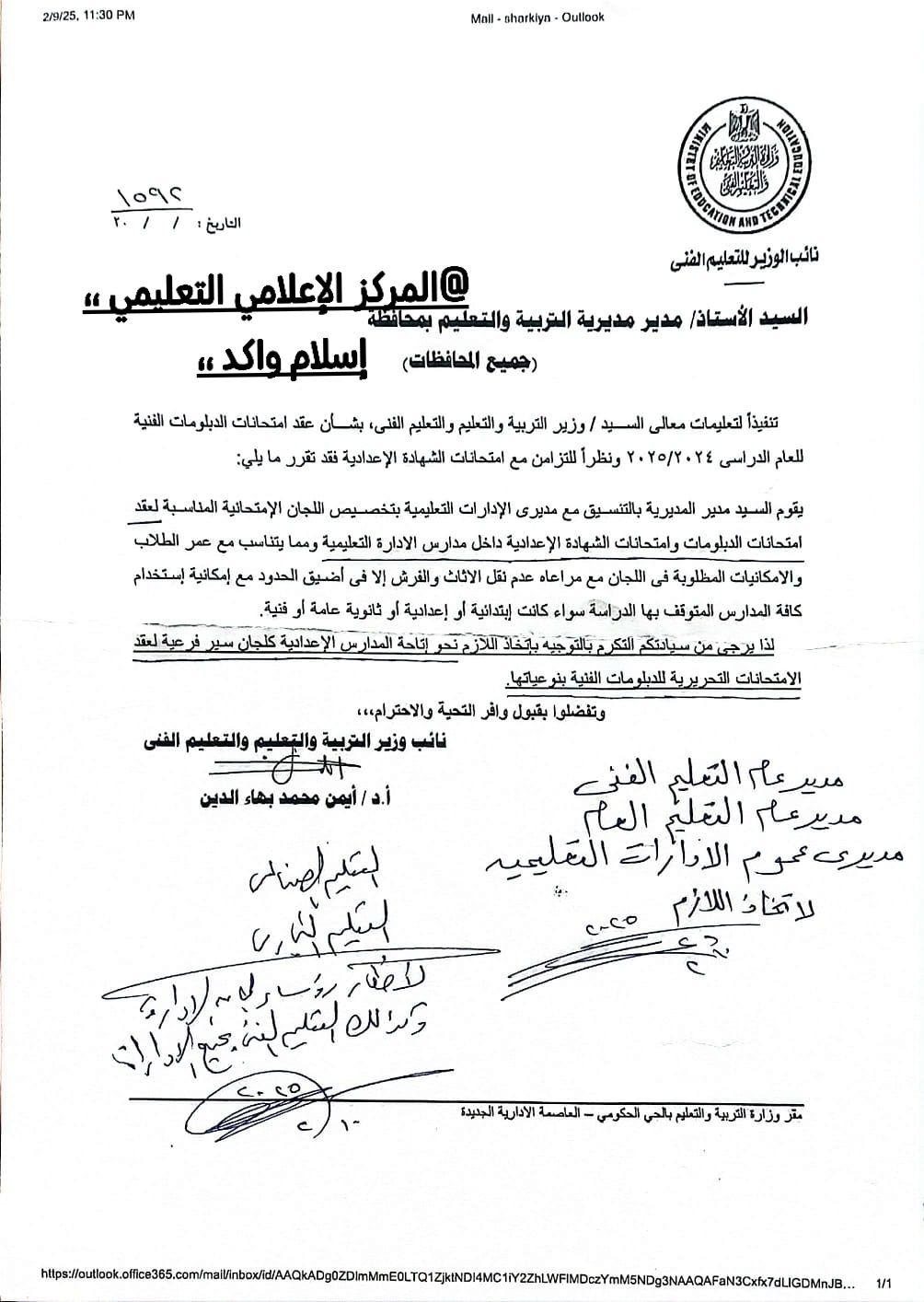 وطالبت وزارة التعليم، بالتوجيه باتخاذ اللازم نحو إتاحة المدارس الإعدادية كلجان سير فرعية لعقد الامتحانات التحريرية للدبلومات الفنية بنوعياتها.