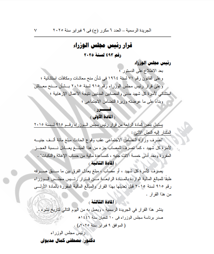 ونص القرار في المادة الأولى على أن يستبدل بنص المادة الرابعة من قرار رئيس مجلس الوزراء رقم 915 لسنة 2015 المشار إليه النص الآتي: تصرف وزارة التضامن الاجتماعى عقب وقوع الحادث مبلغ مائة ألف جنيه لأسرة كل شهيد في حادث إرهابي، كما تصرف للمصاب جزء من هذا المبلغ يعادل نسبة العجز المقررة وبحد أدنى خمسة آلاف جنيه، كمساعدة مالية من حساب الإغاثة والنكبات.