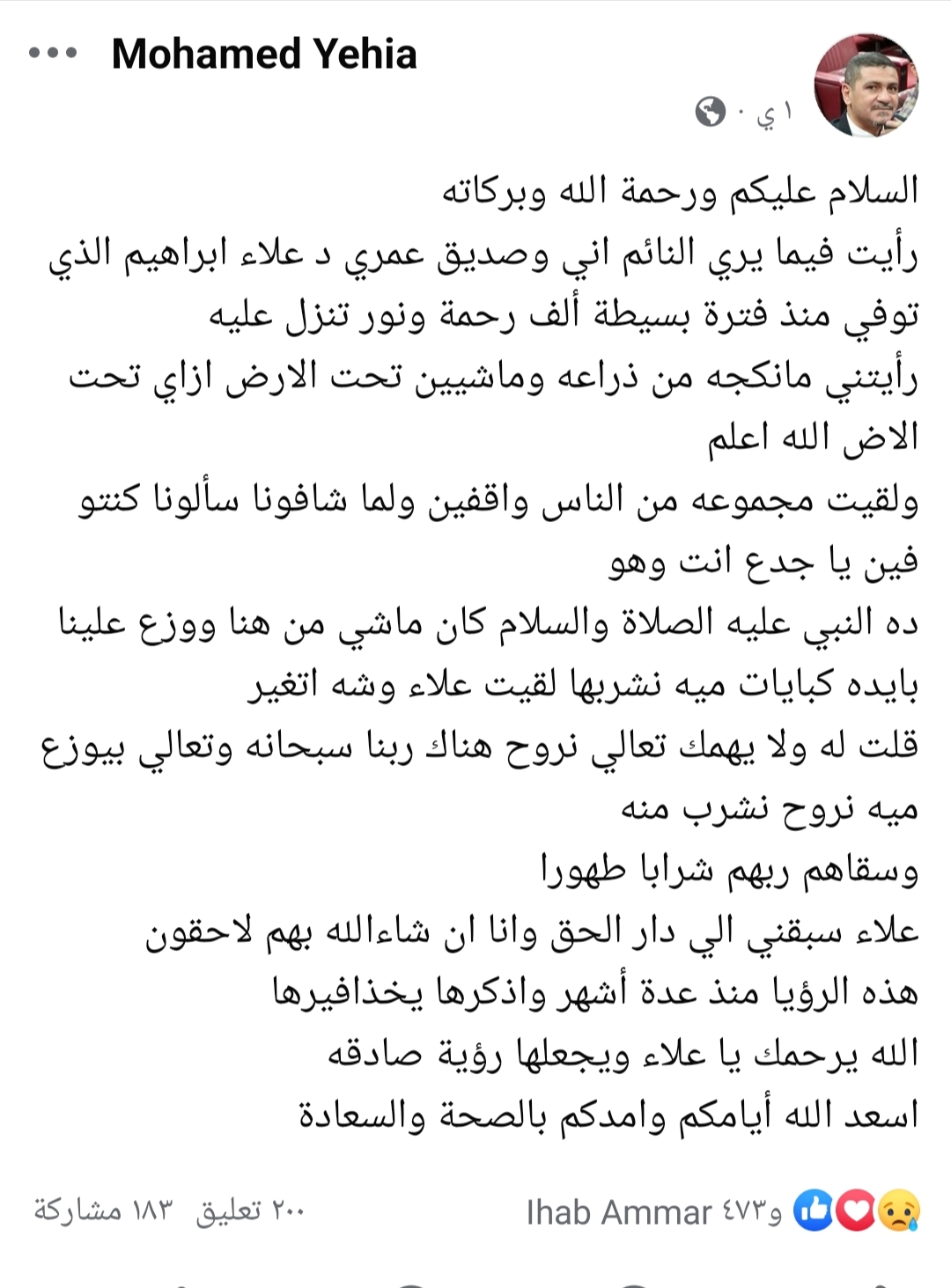 رأيت فيما يرى النائم أني وصديق عمري د. علاء إبراهيم الذي توفي منذ فترة بسيطة ألف رحمة ونور تنزل عليه، رأيتني مانكجه من ذراعه وماشيين تحت الأرض إزاي تحت الأرض الله أعلم.