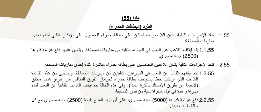 وتنص لائحة رابطة الأندية المصرية المحترفة على أنه يتم إيقاف اللاعب الحاصل على بطاقة حمراء مباشرة في مباراة واحدة فقط وهي في حالة إذا منع اللاعب المنافس من إحراز هدف محقق، وفي هذه الحالة يتم إيقاف اللاعب تلقائيًا عن اللعب في مباراة واحدة ودفع غرامة 5000 جنيه.