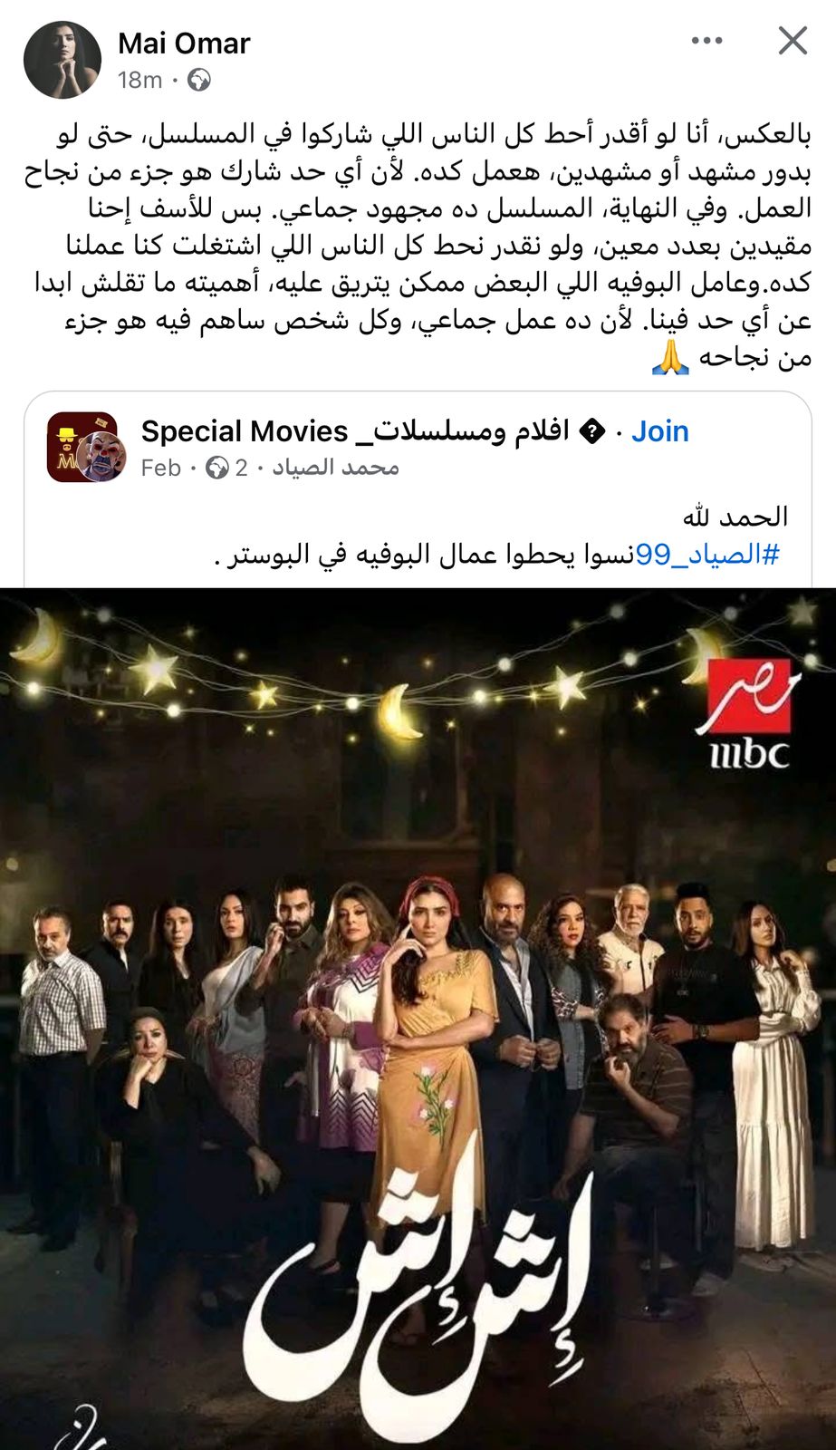وقالت مي عمر عبر حسابها الشخصي بموقع التواصل الاجتماعي فيسبوك: بالعكس، أنا لو أقدر أحط كل الناس اللي شاركوا في المسلسل، حتى لو بدور مشهد أو مشهدين، هعمل كده، لأن أي حد شارك هو جزء من نجاح العمل وفي النهاية.