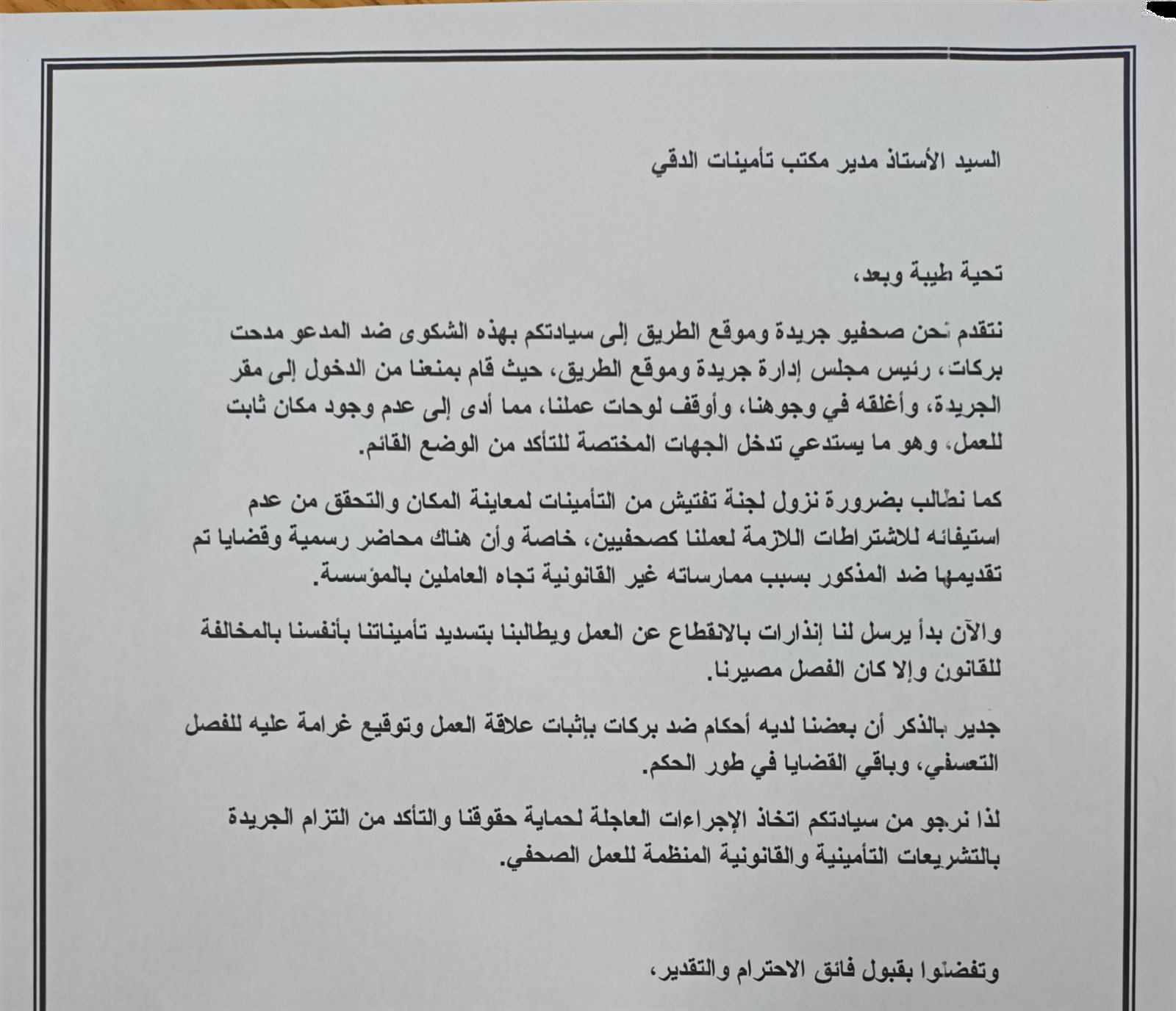 نتقدم نحن صحفيو جريدة وموقع الطريق إلى سيادتكم بهذه الشكوى ضد المدعو مدحت بركات، رئيس مجلس إدارة جريدة وموقع الطريق، حيث قام بمنعنا من الدخول إلى مقر الجريدة، وأغلقه في وجوهنا، وأوقف لوحات عملنا، مما أدى إلى عدم وجود مكان ثابت للعمل، وهو ما يستدعي تدخل الجهات المختصة للتأكد من الوضع القائم.