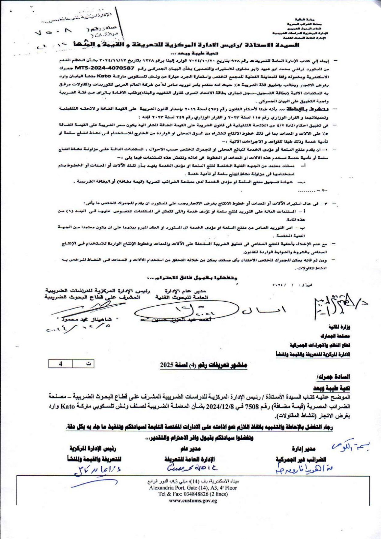 وتابعت الجمارك في منشور التعريفات رقم 4 لسنة 2025 المرسل للمنافذ الجمركية، بأن قرار الإدارة المركزية للدراسات الضريبية المشرفة على قطاع البحوث الضريبية بمصلحة الضرائب المصرية، أن لصنف ونش تلسكوبي ماركة Kato الوارد بغرض الاتجار لنشاط المقاولات، يعامل معاملة المعدات المستوردة بغرض الإنتاج برسوم ضريبة قيمة مضافة.