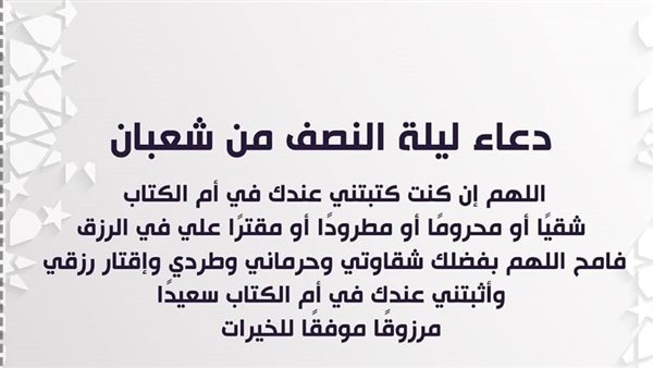 يمكنك قول دعاء ليلة النصف من شعبان، بداية من مغرب اليوم الخميس، حيث ستبدأ الليلة التي يغفر فيها الله سبحانه وتعالى للمؤمنين جميعًا إلا لمشرك أو مشاحن، وذلك حسبما قال لنا الرسول صلى الله عليه وسلم في حديث صحيح وارد عنه، وهو ما يجعل البحث متزايدًا للوصول إلى صيغة مكتوبة مستجابة، يتم استغلال كل الساعات في ذكرها فقط؛ لهذا تيسيرًا عليكم في فعل العمل الصالح، نستعرض لكم في هذه النقاط، دعاء ليلة النصف من شعبان 2025-1446.