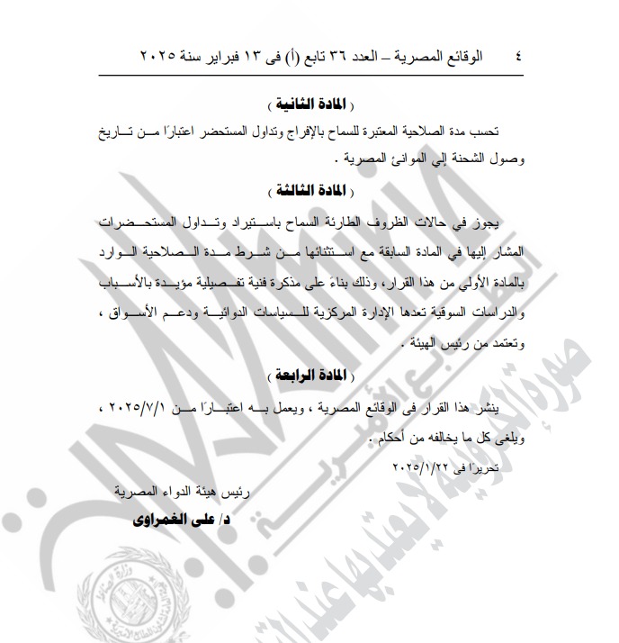 وأما المادة الثانية فجاءت كالتالي: تحسب مدة الصلاحية المعتبرة للسماح بالإفراج وتداول المستحضر اعتبارا من تاريخ وصول الشحنة إلى الموانئ المصرية، فيما نصت المادة الثالثة على أنه: يجوز في حالات الظروف الطارئة السماح باستيراد وتداول المستحضرات المشار إليها في المادة السابقة مع استثنائها من شرط مدة الصلاحية الوارد بالمادة الأولى من هذا القرار، وذلك بناء على مذكرة فنية تفصيلية مؤيدة بالأسباب والدراسات السوقية تعدها الإدارة المركزية للسياسات الدوائية ودعم الأسواق، وتعتمد من رئيس الهيئة.